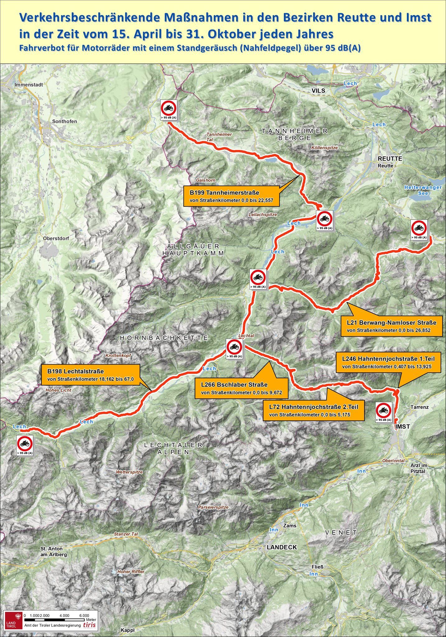 Das Fahrverbot für zu laute Motorräder wurde im Jahr 2021 von der Tiroler Landesregierung erlassen, gilt jährlich vom 15. April bis 31. Oktober und betrifft das Tannheimertal, den Gaichtpass, das Lechtal, Namlostal (Berwangertal) und das Hahntennjoch (siehe Bild unten).