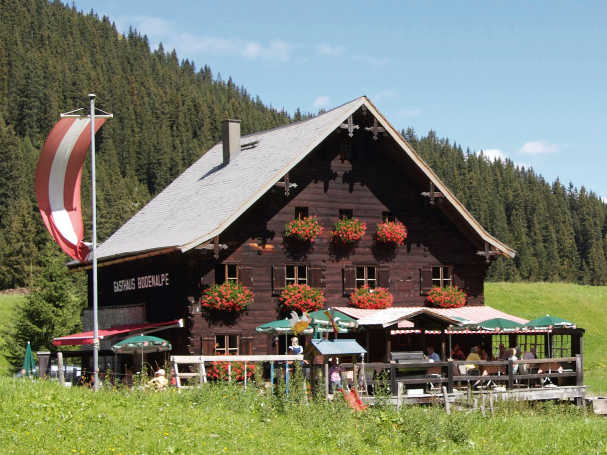 Das rustikale Gasthaus Bodenalpe ist ein 400 Jahre altes Bauernhaus und liegt direkt zwischen Lech und Warth.
