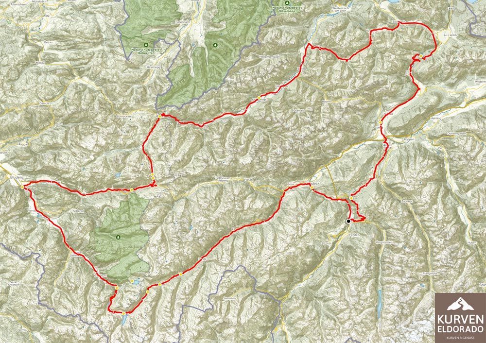 Die Beschreibung der Motorradtour startet bei Prutz. Bevor es Richtung Kaunertal geht, links in Richtung Kauns/ Piller Sattel abbiegen. Von Kauns die teilweise sehr schmale Straße zum Piller Sattel (Naturparkhaus). Beim Naturparkhaus befindet sich ein toller Aussichtspunkt auf das Inntal. Vom Piller Sattel weiter nach Wenns. Trotz laufendem Ausbau der Pillerstraße befinden sich noch genügend Engstellen wo Vorsicht geboten ist. Von Wenns links in Richtung Imst durch das Gurgltal nach Nassereith . Die Straße über den Fernpaß bis Bichlbach ist meistens stark befahren , bei der Raststation am Blindsee lohnt sich ein Halt mit Blick auf die Zugspitze. Ab Bichlbach nach links in das Berwangertal, auch Namlostal genannt, mit teils schmalen aber großteils gut ausgebauten Straßenstücken. Bei Stanzach links das Lechtal entlang über Elbingenalp (Schnitzhandwerk) bis nach Warth . Die Straße von Warth nach Lech ist anfangs schmal, dann aber zweispurig. Von Lech über Zürs und den Flexenpaß , mit seiner langen Galerie, bis zur Kreuzung, dort rechts nach Stuben. Weiter in Richtung Bludenz und davor links in das Montafon über Schruns, St. Gallenkirch und Partenen über die Silvretta Hochalpenstraße zur Bielerhöhe (Maut). Von der Mautstelle geht es in zahlreichen Kurven bis zur Bielerhöhe und den Silvretta-Stausee . Nach einer Pause, weiter in Richtung Galtür (Abzweigung Kops Stausee, nach der Mautstelle) durch das Paznauntal, über Ischgl und See bis nach Landeck . In Landeck beim Kreisverkehr in der Stadt geradeaus, und nach der Brücke rechts in das Oberinntal zurück nach Prutz. (Text: K. Kirschner www.kurveneldorado.com)